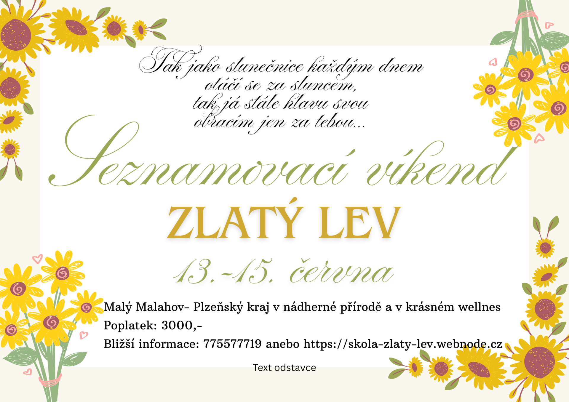 Vedle školy pečujeme též o prostor Zlatý lev, kde je mnoho krásného prostoru pro nejrůznější akce typu svatby, oslavy, víkendové rodinné pobyty, relaxaci, apod.